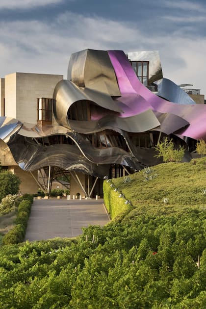El techo de la bodega está construido en titanioUna visita a la “ciudad del vino”, como apodan a este château español del siglo XXI, permite conocer el edificio original de la bodega de 1860, su ampliación de 1883, pero también el Hotel Marqués de Riscal, a Luxury Collection Hotel diseñado también por O. Gehry, un spa de vinoterapia y un restaurante.